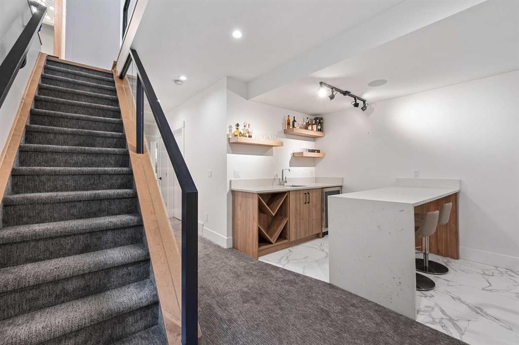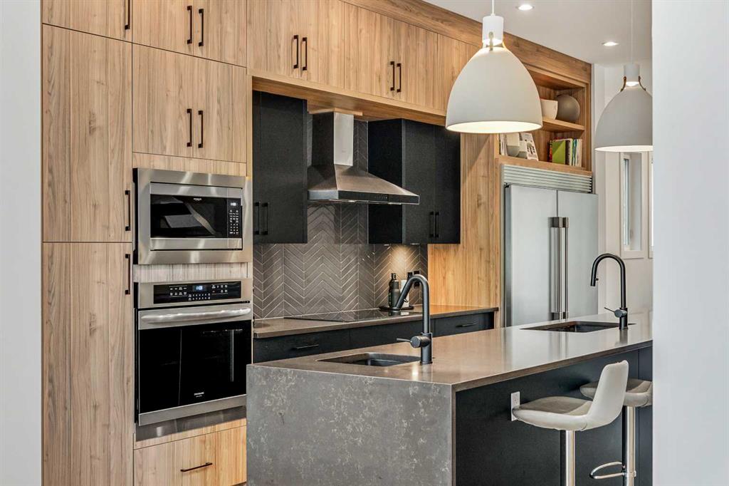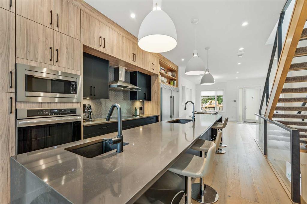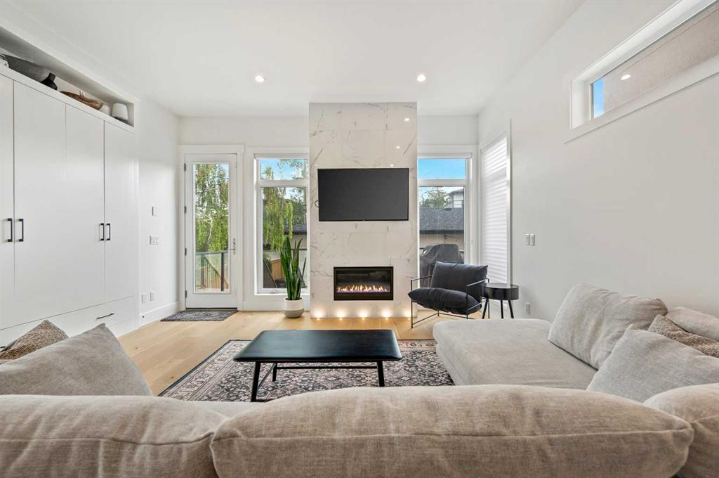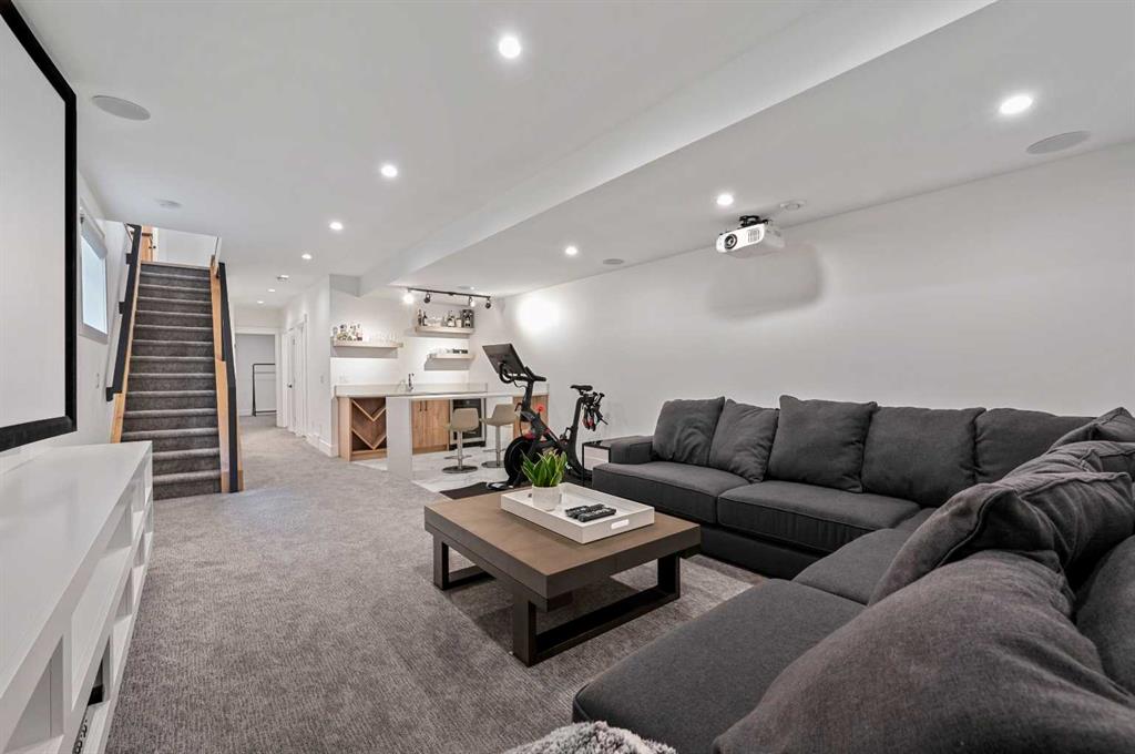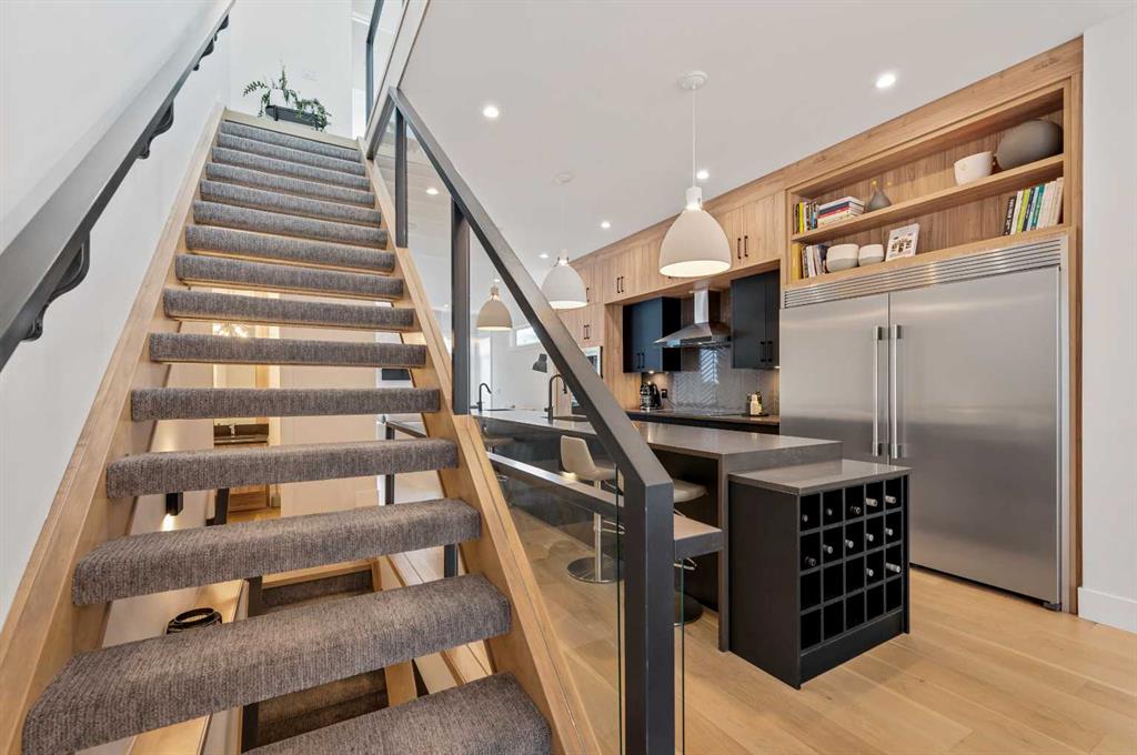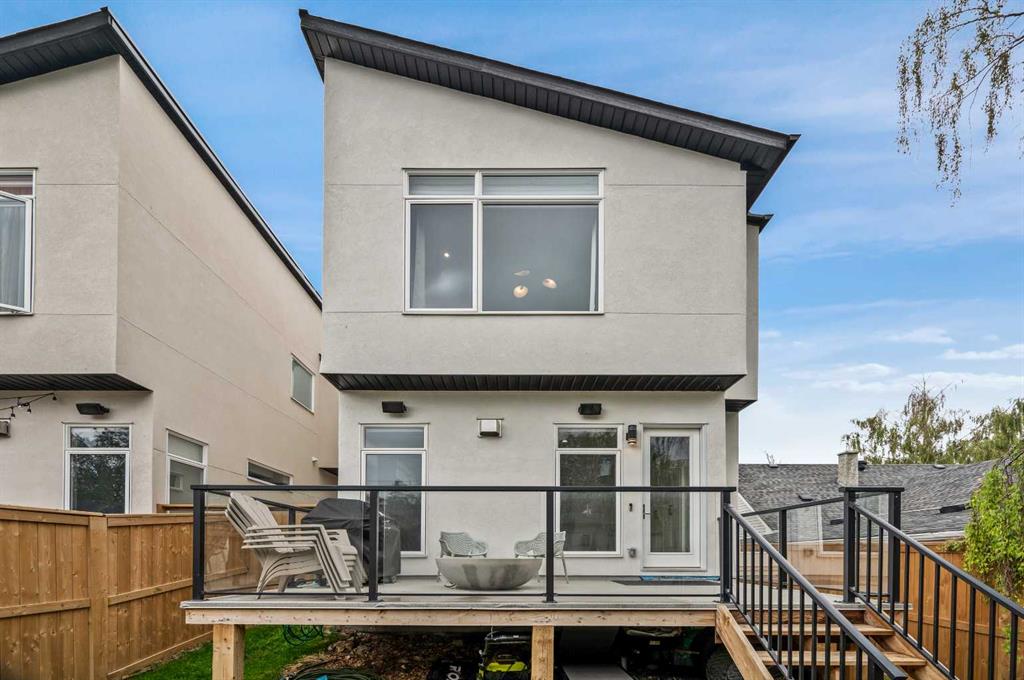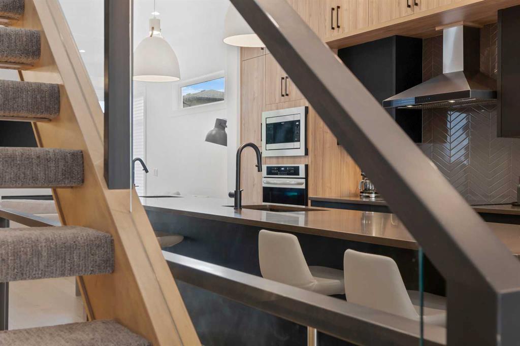 Upscale ‘Organic Modern’ detached infill in the vibrant community of Shaganappi, better-than-new, and truly move-in-ready with loads of added extras including central AC, insulated and heated garage, designer blinds, induction cook-top, media-room with projector & screen, wine area, landscaping, and more. Expertly crafted, this 2-storey home offers over 2,012 square feet of upgraded living space, designed with style and practicality in mind. The warm and welcoming open-concept floor-plan is brimming with natural light and offers spacious primary living spaces, 4 bedrooms, 3.5 bathrooms a fully developed basement and double detached garage. At the centre of the main floor, the chef’s kitchen boasts extensive ceiling height cabinetry, stainless-steel appliances with induction cook-top, built-in wall-oven and full-sized side-by-side fridge and freezer, massive island with waterfall counter feature, and ample bar seating for entertaining. The living room centres on a modern gas fireplace with a fully tiled feature wall and oversized windows on both sides. Highlighted by sleek glass railings, the wood-wrapped open-riser staircase leads to the second level. Upstairs, the second-floor hosts three generous-sized bedrooms, two full bathrooms and a private laundry room with modern tile, a built-in sink and stacked appliances. The stunning master retreat features a soaring vaulted ceiling, elegant gas fireplace, a massive walk-in closet with plentiful built-ins, and a private 5-pc ensuite bath with heated tile floors, walk-in steam shower, and a drop-in soaker tub. Downstairs, the basement is perfect for entertaining, with a huge rec room, a built-in media-wall with a 3D projector and screen, and a wet bar with an island and bar seating. Double detached garage is insulated, heated, with handy ceiling-mounted metal storage system. Complete with a security system and rough-in’s for central vac and in-floor basement heat this home truly has it all. The outdoor space is sure to wow and showcases exterior media speakers and a built-in Lunar Gas Fire Bowl making this a perfect place for entertaining both winter and summer! New home warranty includes building envelope and structural coverage. A solid investment in a thriving community! See Video Tour and book your showing today!