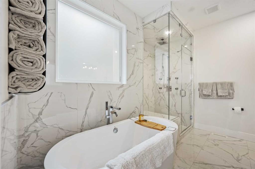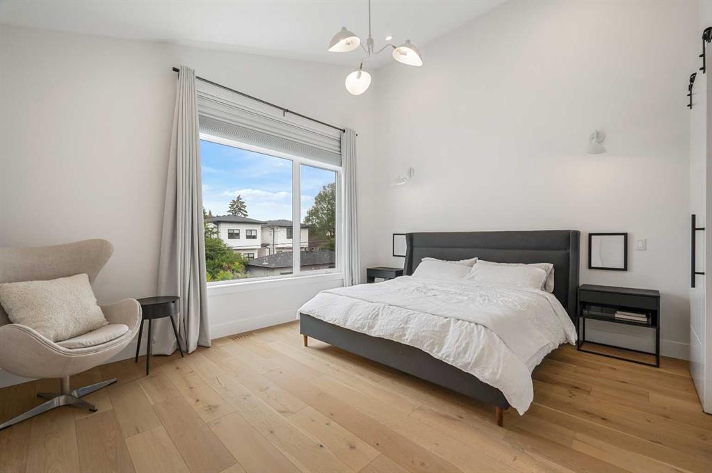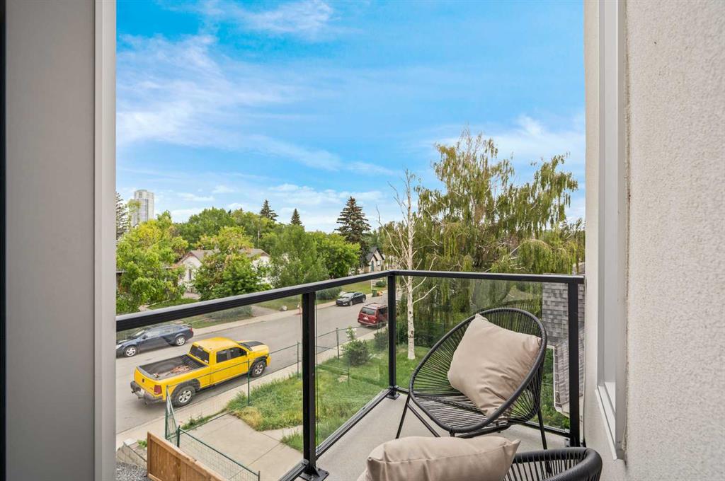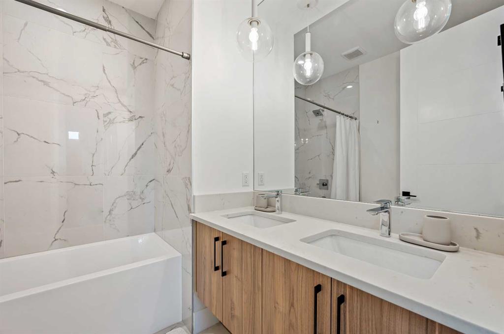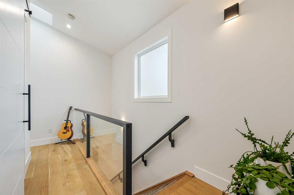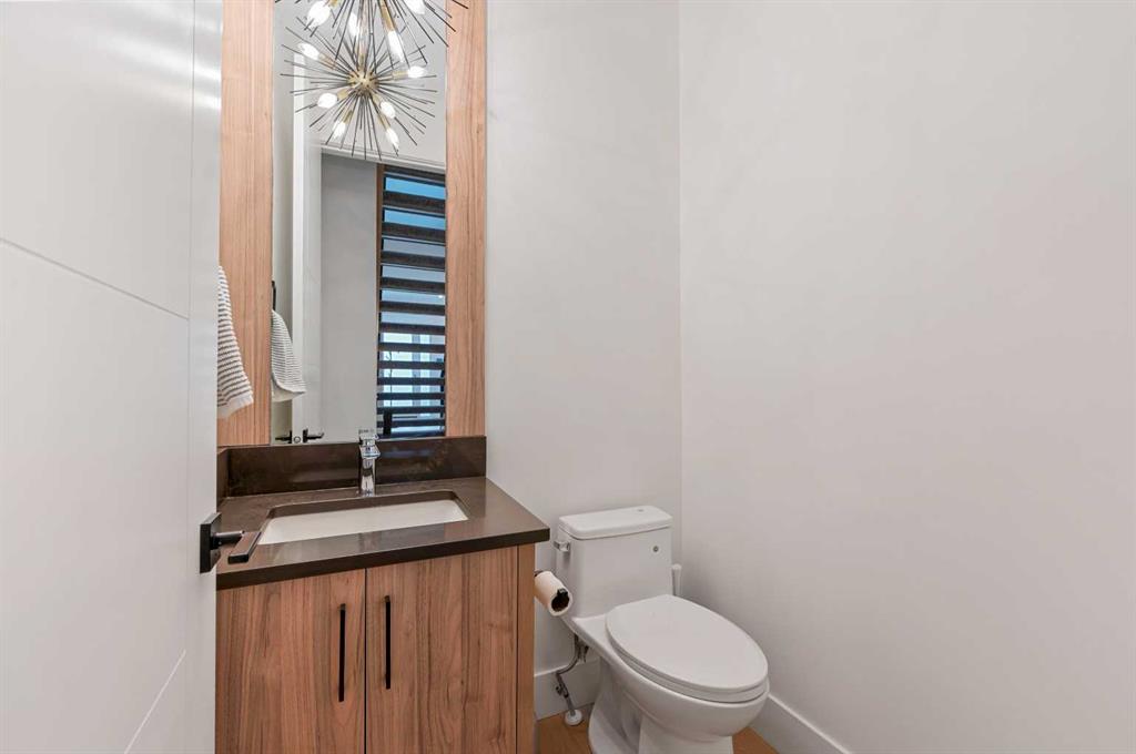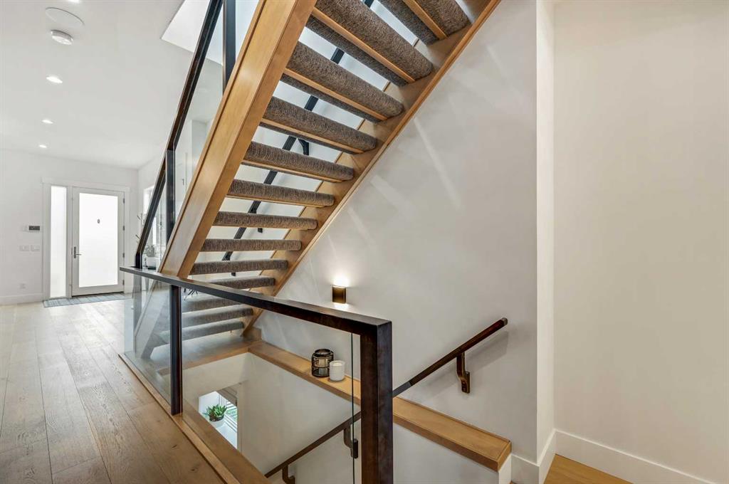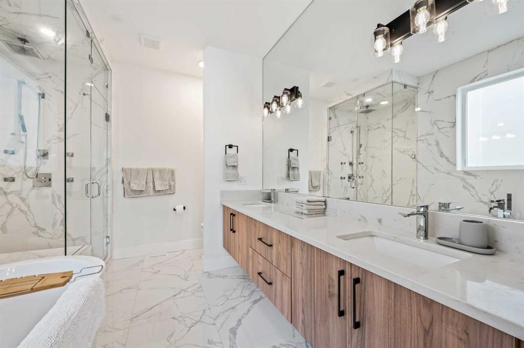 Upscale ‘Organic Modern’ detached infill in the vibrant community of Shaganappi, better-than-new, and truly move-in-ready with loads of added extras including central AC, insulated and heated garage, designer blinds, induction cook-top, media-room with projector & screen, wine area, landscaping, and more. Expertly crafted, this 2-storey home offers over 2,012 square feet of upgraded living space, designed with style and practicality in mind. The warm and welcoming open-concept floor-plan is brimming with natural light and offers spacious primary living spaces, 4 bedrooms, 3.5 bathrooms a fully developed basement and double detached garage. At the centre of the main floor, the chef’s kitchen boasts extensive ceiling height cabinetry, stainless-steel appliances with induction cook-top, built-in wall-oven and full-sized side-by-side fridge and freezer, massive island with waterfall counter feature, and ample bar seating for entertaining. The living room centres on a modern gas fireplace with a fully tiled feature wall and oversized windows on both sides. Highlighted by sleek glass railings, the wood-wrapped open-riser staircase leads to the second level. Upstairs, the second-floor hosts three generous-sized bedrooms, two full bathrooms and a private laundry room with modern tile, a built-in sink and stacked appliances. The stunning master retreat features a soaring vaulted ceiling, elegant gas fireplace, a massive walk-in closet with plentiful built-ins, and a private 5-pc ensuite bath with heated tile floors, walk-in steam shower, and a drop-in soaker tub. Downstairs, the basement is perfect for entertaining, with a huge rec room, a built-in media-wall with a 3D projector and screen, and a wet bar with an island and bar seating. Double detached garage is insulated, heated, with handy ceiling-mounted metal storage system. Complete with a security system and rough-in’s for central vac and in-floor basement heat this home truly has it all. The outdoor space is sure to wow and showcases exterior media speakers and a built-in Lunar Gas Fire Bowl making this a perfect place for entertaining both winter and summer! New home warranty includes building envelope and structural coverage. A solid investment in a thriving community! See Video Tour and book your showing today!