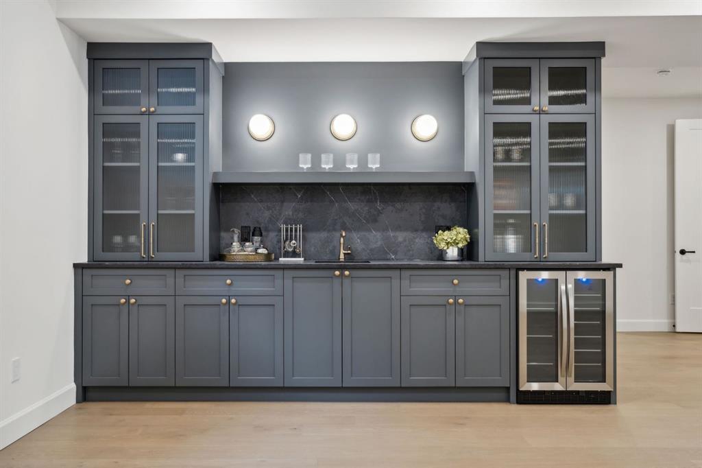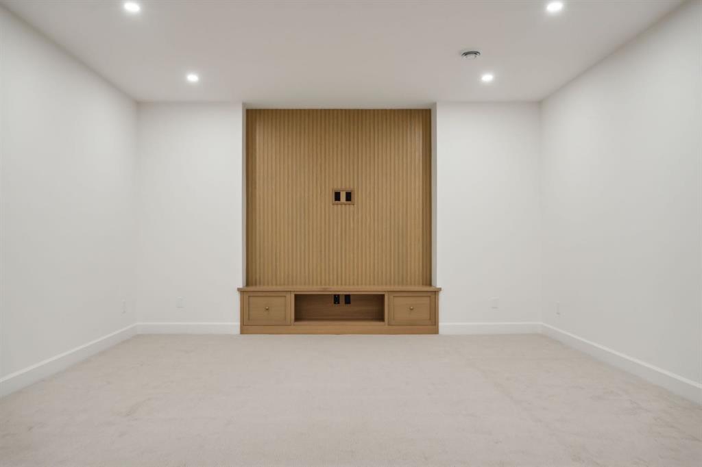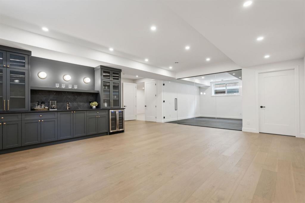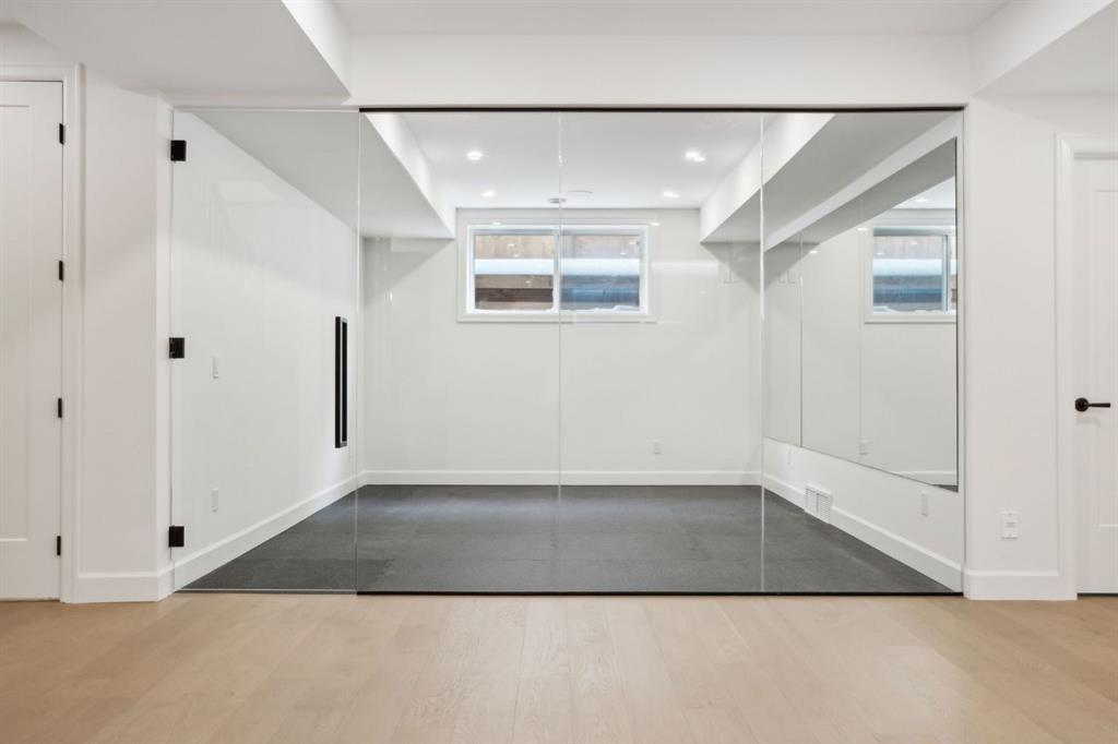 The fully developed basement offers an additional (5th) bedroom, 3-piece bath, recreation room with wet-bar & built-ins, a dedicated media room, and inspiring home gym enclosed by 10-mil glass and a mirrored wall.