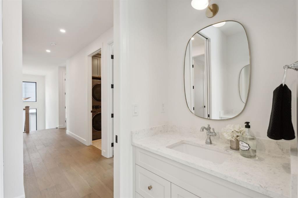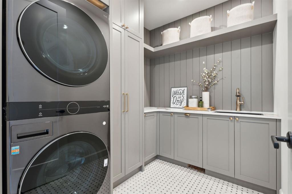 Upstairs, the primary suite is a haven of luxury, featuring vaulted ceilings, a white oak feature wall, a custom walk-in closet, and an opulent en-suite designed for ultimate relaxation. The second bedroom offers its own walk-in closet and en-suite bath, while the third and fourth bedrooms share a 5-piece bath with dual vanities. A spacious laundry room with a sink, cabinetry, and folding area completes the upper floor.