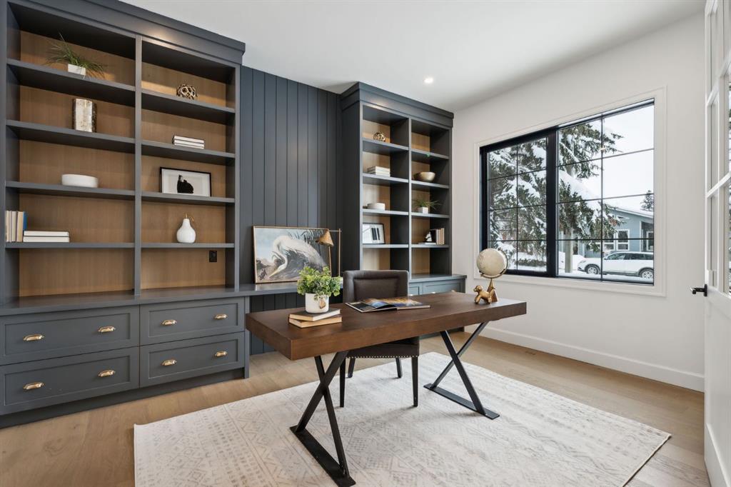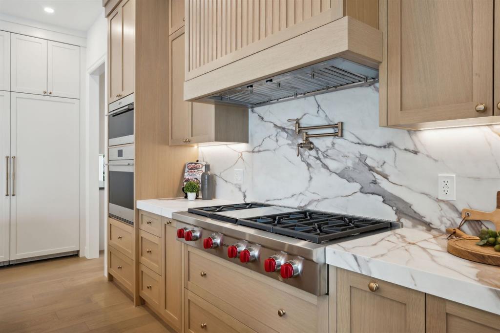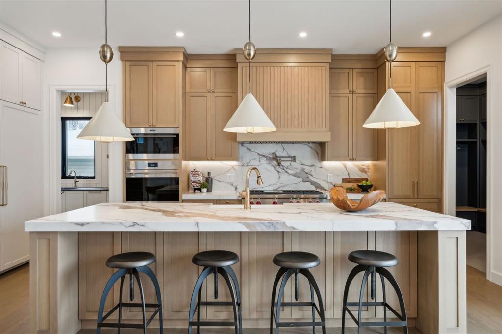 Inside, the home showcases wide-plank oak hardwood flooring and custom millwork throughout. The main floor effortlessly transitions from a welcoming foyer to an elegant dining area and a great room anchored by a cozy gas fireplace. The chef-inspired kitchen, adorned with site-built white oak cabinetry and premium mitred quartz countertops, is equipped with high-end Wolf and Sub-Zero appliances, an oversized island, a butler’s pantry, and a walk-in pantry—perfect for everyday living and entertaining. A private home office with extensive built-ins adds practicality and charm.
