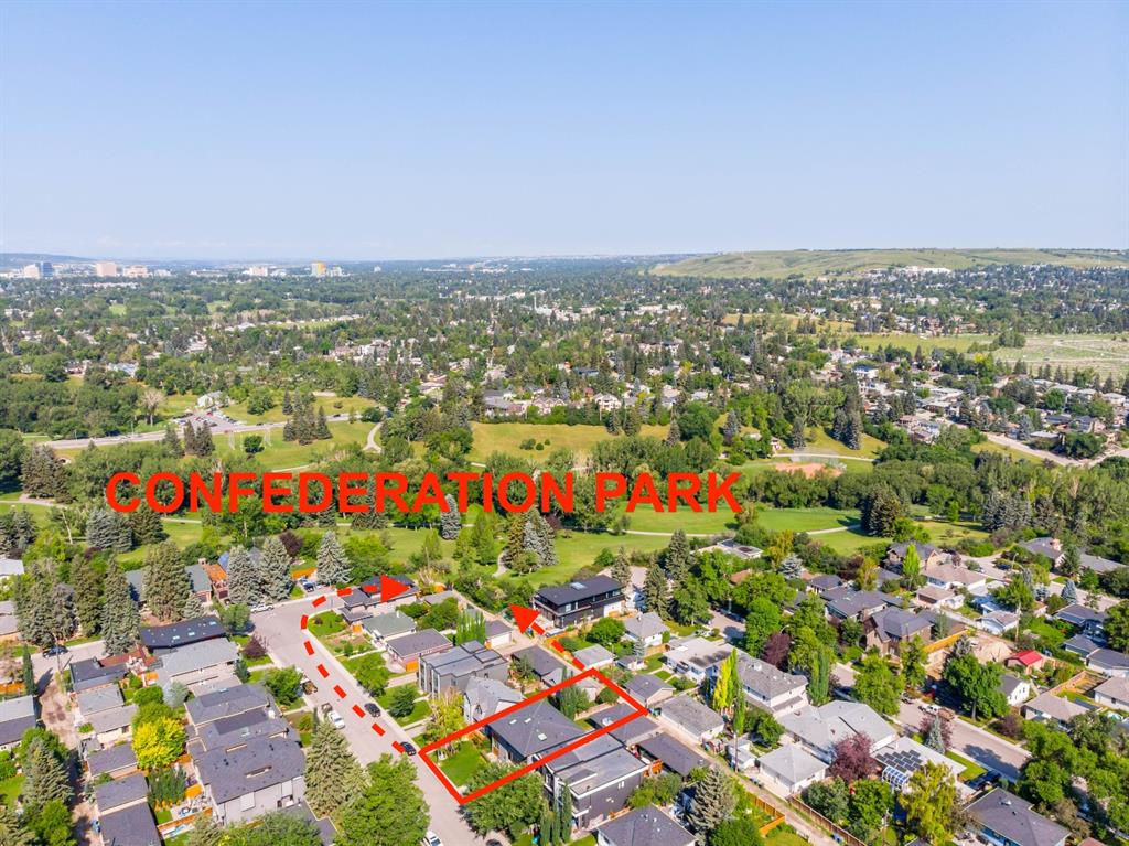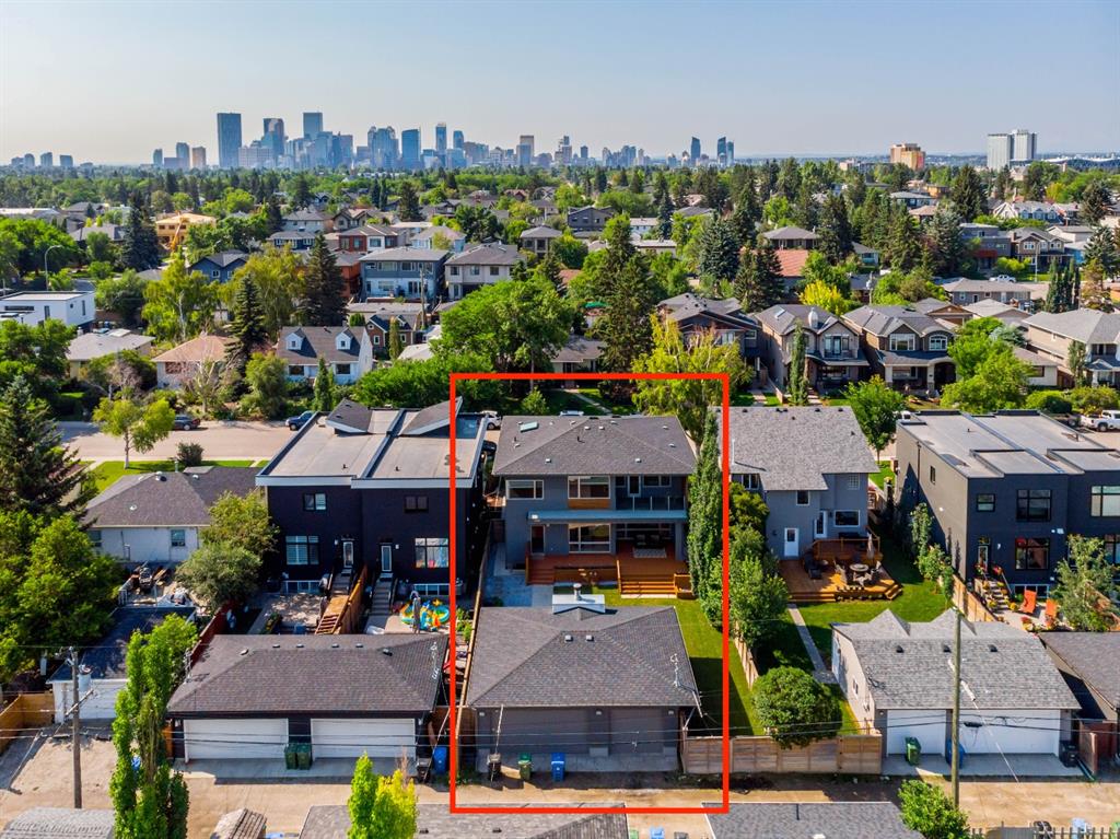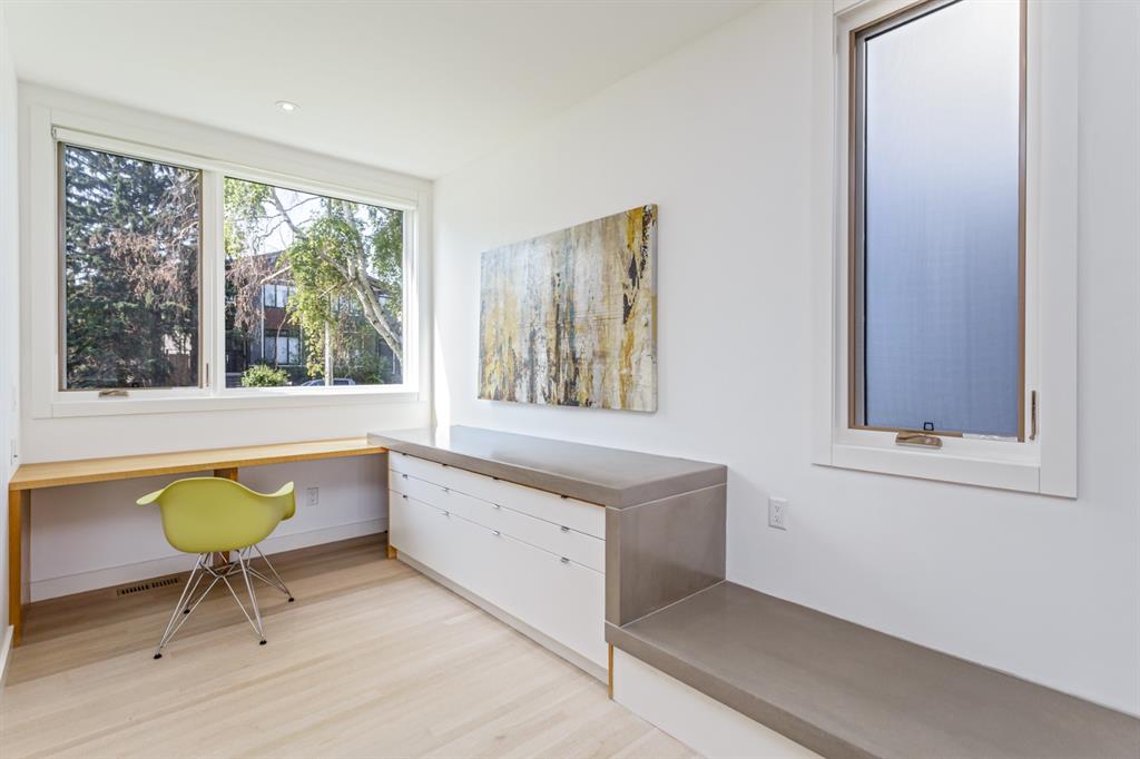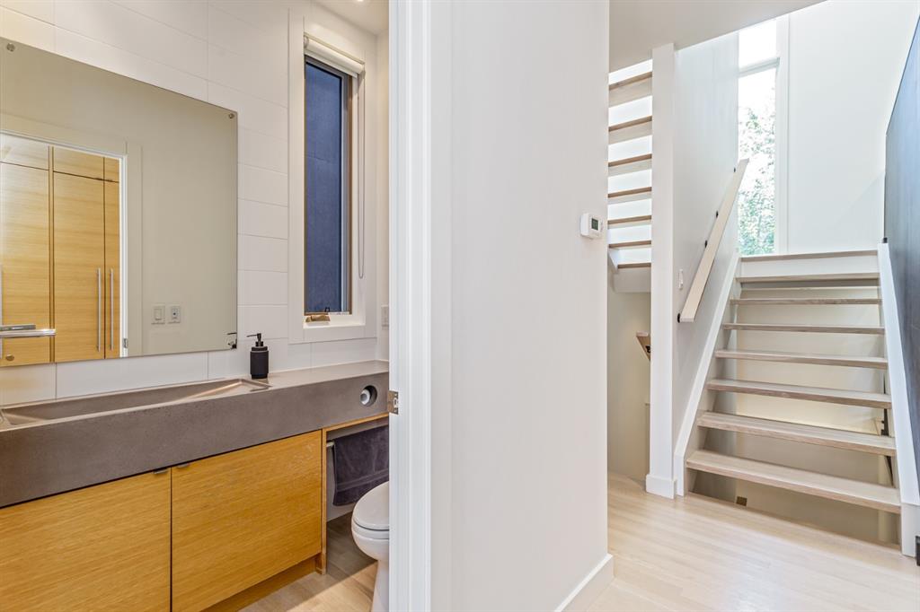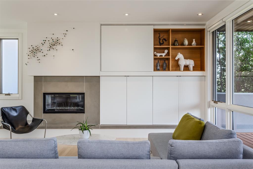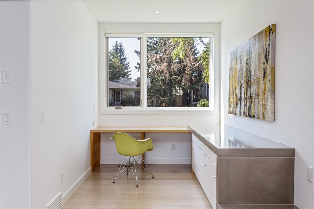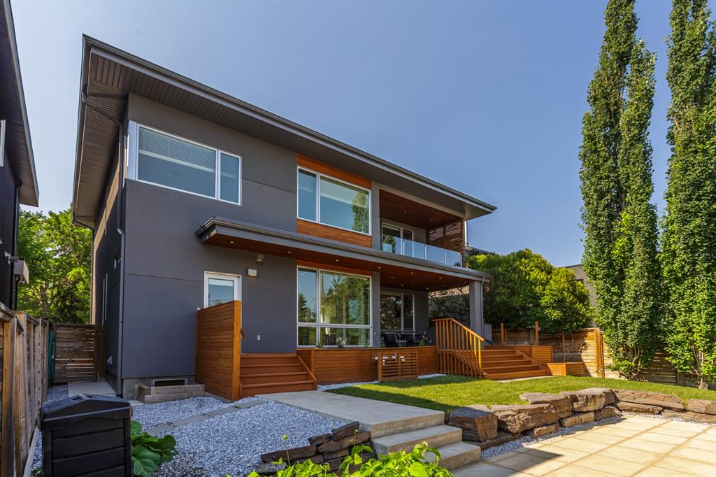 Ideal family home located in the desirable NW community of Mount Pleasant on a picturesque tree-lined street, steps from the paths, parks, & serenity of Confederation Park. Completed by award-winning Alloy Homes – the “Grey House” project, as it is known, “… is a wide-lot infill project near a large park designed to be bright and airy throughout the year …” Situated on a full 50’ wide x 120’ deep lot, this 3+1-bedroom, 3.5 bath, two-storey home with over 3,500 sq.ft. of developed space offers ample room for both indoor & outdoor living. Designed for the discerning consumer with attention to detail in mind, this home offers a rich combination of natural woods, stone, glass & metal woven together in a contemporary expression. Main-level features open-concept plan with floor-to-ceiling windows, site-finished oak flooring, centered around an inviting kitchen fitted with the finest of appliances, wall of rift-cut cabinets, quartz covered island, & breakfast bar. Living area features a creative wall of built-ins, signature linear fireplace with decorative concrete accents siding onto a smart main-floor office area with ample built-ins of its own. The cedar covered back deck offers seamless indoor-outdoor living with access to professionally landscaped yard, vegetable garden, open grass play space & patio, complete with natural wood-burning fireplace. Rear mudroom with lockers & smart storage ensures everything will be in its place. Open-riser wood stairs with decorative iron railings lead to the upper level featuring second fully-fitted office space, a generously sized master retreat with covered balcony, walk-in closet, skylight, ample built-ins, luxurious 5-piece ensuite bath, two additional bedrooms, 4-pce bath, & laundry. Lower level features wide-open living area wired for surround-sound, built-in wet-bar, extra-large fitness room with rubber flooring, 4th bedroom, 4-pce bath & storage area – all with in-floor heating. Triple garage with radiant heat completes the package. A solid investment – book your private viewing today!